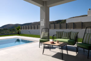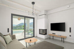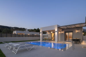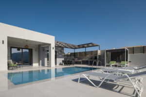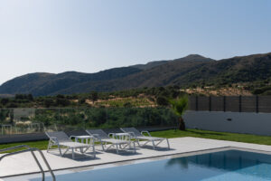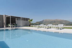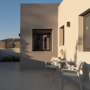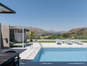 Just a 20-minute drive will take you to the south coast with the popular and award-winning beaches of southern Rethymno and the crystal clear waters of the Libyan Sea. The comfortable outdoor area in an idyllic green environment 250 sq.m. with a private outdoor pool (heated at an extra charge – upon request) 30 sq.m. and a depth of 1.45 m, offers stunning views of the horizon and the countryside and invites you to relax with family or friends, creating endless moments of joy and tranquility while enjoying the Cretan summer. The residence is located entirely on the ground floor and features beautifully designed interiors with full access to the courtyard and pool. The energy consumed is produced from renewable sources! (GreenPass pro by DEI)