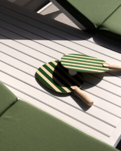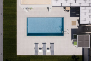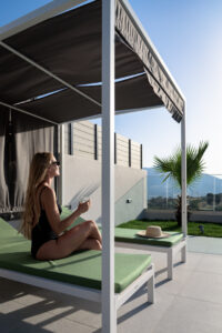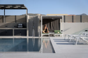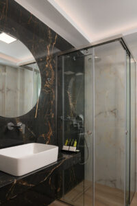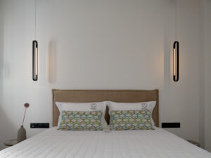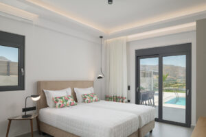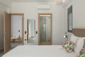 The bedrooms are elegantly designed and furnished and include high-quality beds with natural mattresses (cosmostrom) and bedding (100% cotton), built-in wardrobes, and air conditioning for a restful night’s sleep. Specifically, the double bedroom with garden view has a queen-size bed (1.60 x 2.00), and the double bedroom with pool view has two single beds (0.90 x 2) that can be joined with a topper (upon request) and converted into a king-size bed. The villa can comfortably accommodate up to 4 people in the two bedrooms, and one more guest can sleep on a fold-out bed (upon request) that can be placed in the bedroom with the two single beds.