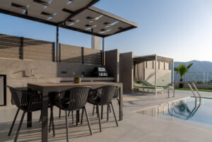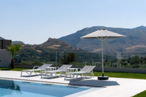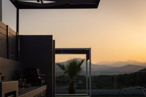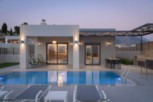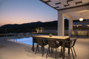 The villa’s outdoor area covers 250 m2 of beautiful private surroundings, offering comfort and fully equipped with sun loungers, a gazebo, lounge, pool umbrella, outdoor dining area with barbecue facilities (natural gas), and everything necessary for our younger guests to play, so you can enjoy the Cretan sun next to the private outdoor pool (heated – at an extra charge – upon request) 30 m2 and a depth of 1.45 m, or to cook and dine with your friends while admiring the idyllic sunset.
