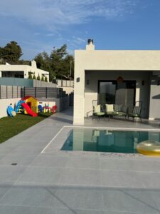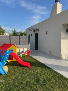 Bath and pool towels are provided • Bathroom amenities are available • Air conditioning in all areas is included and also serves heating purposes • Fireplace (wood provided upon request) • Wi-Fi coverage is available throughout the villa • Outdoor covered dining area • Indoor area 78 m² • Outdoor area 250 m² • Private heated pool (additional charge – upon request) 30 m² pool with a depth of 1.45 m • Outdoor playground • The pool is open seasonally (end of March – mid-November)